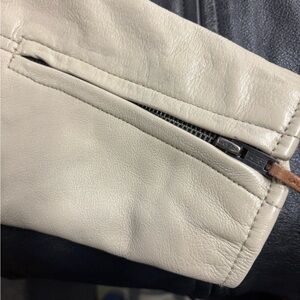 Stylish two-tone leather jacket with iconic branding. Features black and tan colors with orange accents. Ideal for casual wear.