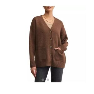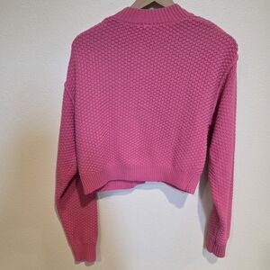 Chic pink cardigan with button-up front. Textured knit design. Ideal for layering.