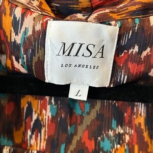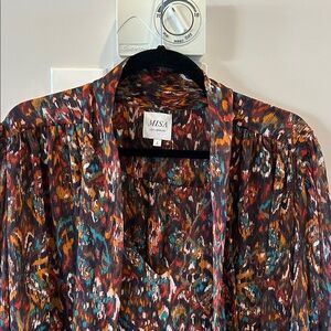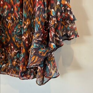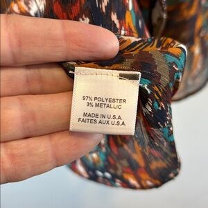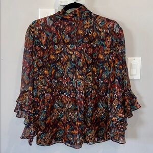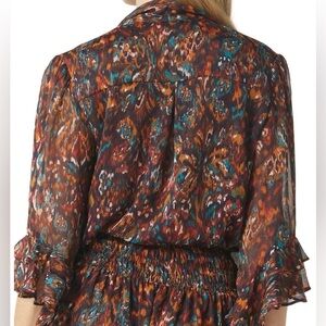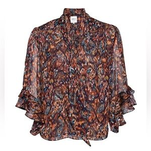 Statement-making chic, the Gigi top is cut from a gorgeous peacock abstract print chiffon with shimmering lurex. Three-quarter sleeves with ruffle trim and a v neckline with neck-tie that can be worn loose and undone for a laid back look or tied in a bow. This workday to weekend look can be paired with black pants or denim for a casual look.