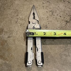 Gerber MP600 Woodsman stainless steel multi-tool. Made in the USA. Includes a sliding, retractable pliers, screw drivers, bottle opener and more. There is some wear to the tip of one of the tools. See photos. Overall in good pre-owned condition with some signs of wear from normal use. Box and sheath not included.