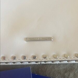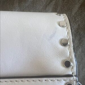 Stylish white crossbody bag by Rebecca Minkoff. Features silver stud accents and a unique strap design. Perfect for adding flair to any outfit. Like new, small mark on the backside of the purse not visible when wearing. See pics.