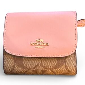 Elegant wristlet with signature Coach pattern. Features coach Poppy face plate with some rubbing on it.