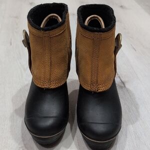 Elevate your look with Sorel's stylish black and tan heeled rain/weather boots. Perfect blend of fashion and function.