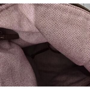 * The interior is lined with a pink check fabric and includes inner and outer pockets for organization.