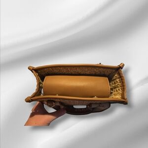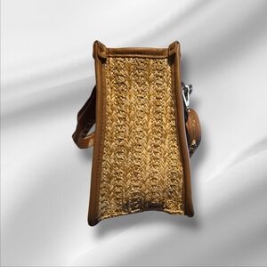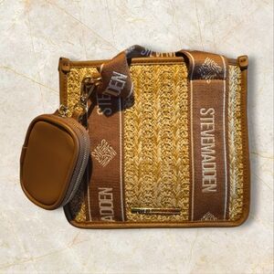 Steve Madden Bwebber, woven w a straw construction design. Magnet closure. Great size purse with a clip on guitar strap that's removable or to be held.