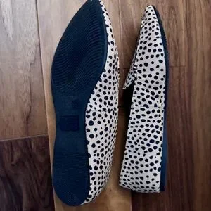 Stylish cream flats with black polka dots in cheetah pattern. Pointed toe. Comfortable and versatile for everyday wear. Has memory foam insole.