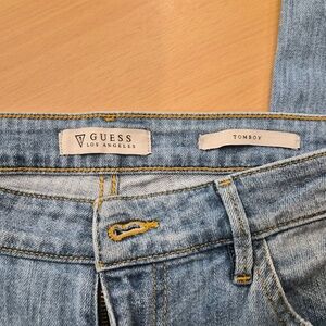 Made from a comfortable primarily cotton denim fabric with a touch of spandex for a stretchy feel, these jeans designed by Guess feature a zip and button closure, a 26-inch inseam, and are machine washable for easy care. The light wash and solid blue color, along with the punk and hipster accents, make these jeans a versatile choice for any style. Made by the popular brand Guess, these jeans are a fashionable addition to any woman's wardrobe. Back pocket features the iconic logo.