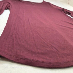 This is a pre-owned women's APT.9 Essentials short-sleeve t-shirt in a maroon color, size L. The fabric composition, visible on the tag, is 67% rayon, 28% polyester, and 5% spandex. It features a scoop neckline and a slightly curved hem. The shirt appears to be in good condition with no obvious flaws. Measurements indicate a chest width of approximately 18 inches and a length of about 25 inches.