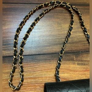 Chanel shoulder bag in black quilted design. Features gold-tone chain strap and logo. Elegant and timeless.