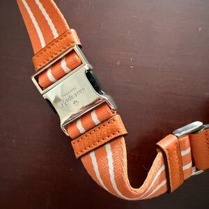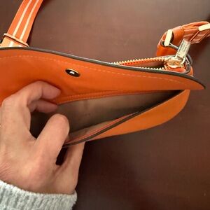Chic Kate Spade crossbody in vibrant tangerine. Features a stylish striped strap. Perfect for daily use.