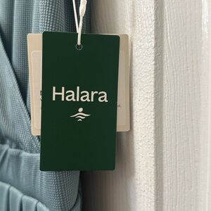Smoke-free home. New with tags and comes in the Halara bag. Pit to pit is 22 inches. Shoulder to bottom of waist band is 21 inches. Shoulder to bottom is 63 inches. Waist band laying flat is 18 inches. The color is almost like a sea foam green but can look gray or light blue. Wide leg.