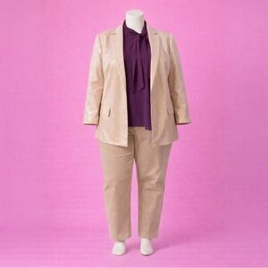 Stylish tan blazer and torrid pants paired with a rich torrid purple blouse. Perfect for a chic and professional look.
