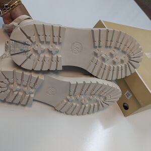 Stylish white combat boots with gold accents. Durable and trendy design. Perfect for any outfit.