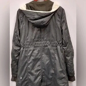 Stylish utility jacket. Features a hood and front zipper. Perfect for versatile Discover your new go-to outerwear piece with this Lululemon Athletica hooded parka. The charcoal gray finish offers a sophisticated, versatile look perfect for any wardrobe. Its design features a cozy sherpa-lined hood and subtle cinching at the waist for a flattering silhouette. The full-zip front and strategically placed pockets add both style and functionality. Ideal for everyday errands, casual outings, or weekend adventures.