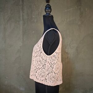 Keywords: Coquette, Balletcore, Fairycore, Soft Girl, Whimsigoth, Romantic, Dollette, Twee, Cottagecore, Princesscore, Y2K, Late 90s, Vintage, Retro, Juniors, Floral Lace, Button Back, Cropped, Sheer, Scoop neck, Sleeveless, Scalloped, Blush, Pale Pink, Peach, Dusty Rose, Pastel, Love Squared