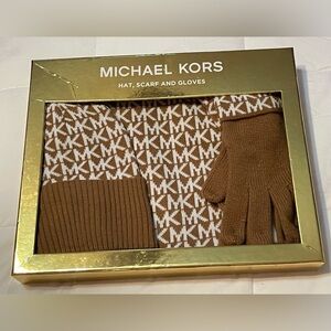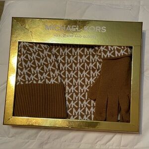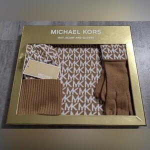 Elegant Camel/Tan Gloves, Hat and Scarf Logo set by Michael Kors. Perfect for a stylish winter look.