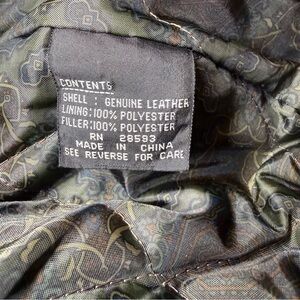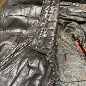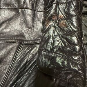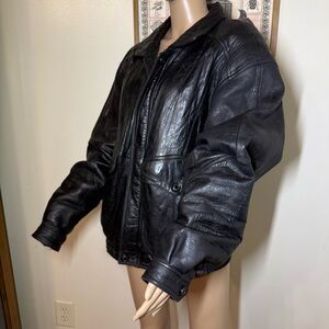 Classic black leather bomber jacket. Features a sleek design. Ideal for a modern look.