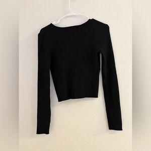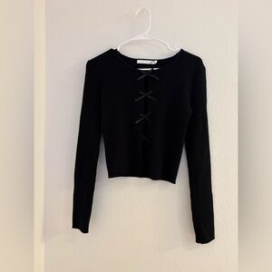 Chic black long sleeve top with bow details. Ribbed texture adds elegance.