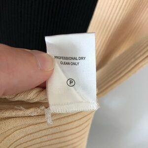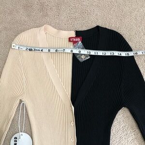 STAUD Shoko sweater dress in a two-tone buff and black colorblock design. This ribbed V-neck midi dress features long sleeves and a button-front closure. It can be worn as a cardigan or dress.