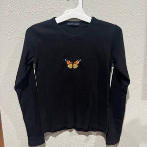 Brandy Melville Black Long Sleeve Top Embroidered Butterfly 100% Cotton OS