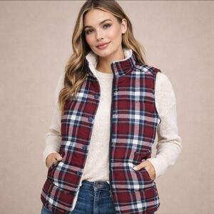 Plaid Sherpa Lined Puffer Vest – Burgundy Navy Cream – Size S