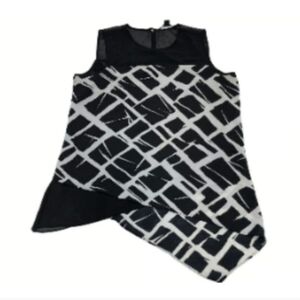 Featuring a black and white geometric pattern, asymmetrical hemline, a sheer black panel at the neckline front and back and a button closure at the back of the neck.