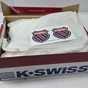 New in box, tried on. Dirt mark on collar of left shoe. See pictures for try on wear. Even comes with K•SWISS stickers!