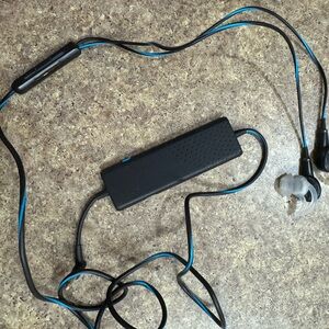 Sleek black and blue in-ear headphones with clear ear tips. Perfect for music lovers.