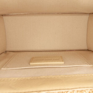 The Le Chiquito Noeud features a raffia body, a rolled raffia handle, a detachable flat leather shoulder strap, a flap with magnetic snap closure, and an interior slip pocket. It carries an AB condition rating.