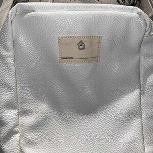 Name tag on the back Carry handle + adjustable strap Waterproof lining. Easy to clean. Easy-care polyurethane exterior (80% PU 20% polyester) Easy-care waterproof liner (100% EVA)