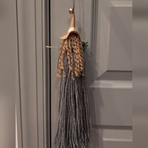 Add a touch of whimsy to your home decor with this charming handmade witch. She's wearing a long gray dress featuring a tan hat and handmade faux leather accents, it's a delightful addition to any setting.