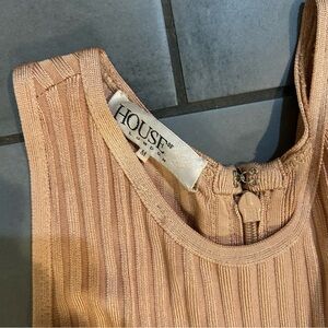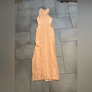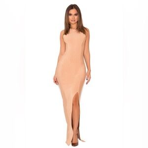 Item Features: Ribbed bodycon maxi dress with a sleeveless silhouette, subtle leg slit, stretchy form-fitting knit, and a neutral nude–tan colorway.