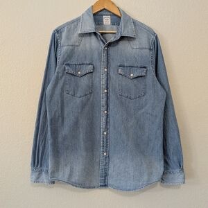 Brooks Brothers Western denim sport shirt in excellent condition. Nice lightweight denim fabric and pearl snap closures. This is a very handsome shirt, I just don't wear this enough and would rather it go to someone who'll wear it! Size medium. Chest: 22", Top to bottom length from high point shoulder: 30.5"