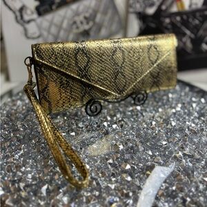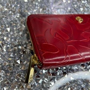 The wallet features a zip-around closure, gold-toned hardware, and a distinctive embossed leaf (or "tulip leaf") pattern.