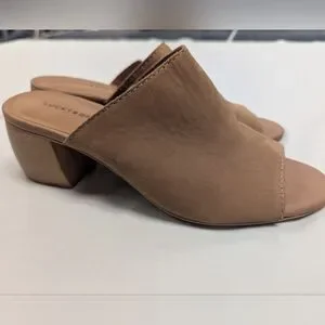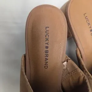 Size 8 Lucky Brand mules with wood grain heel. 100 percent leather upper.