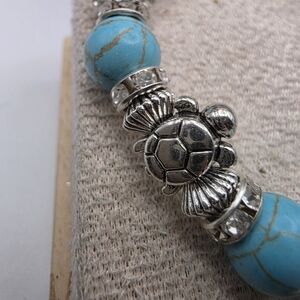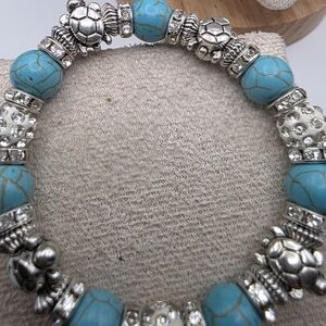 Elegant bracelet featuring turquoise beads and silver turtle charms. Perfect for adding a touch of nature-inspired style to any outfit.