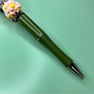 Celebrate your love for true crime with this stylish green handmade beaded pen. The True Crime Club bead is made of silicone and has the design printed on both sides. Underneath it is a clay bead with pink flower charms pressed into it. The base of the pen is an olive green color. It is a new without tags handmade beaded pen but small imperfections may be present. Please see photos for details and approximate measurements. The ink color is black.