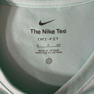 Light green Nike dry fit tee. White logo on chest. Short sleeves.
