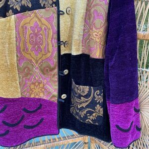 Lovely Velvet and brocade jacket in a 1X, in shades of purple, pink, mauve, olive, and mustard.