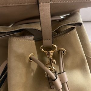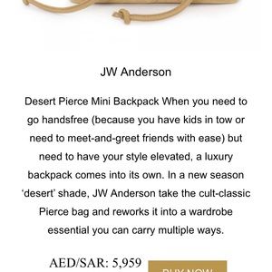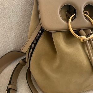 Stylish tan backpack by JW ANDERSON. Features gold ring detail. Perfect for everyday use.