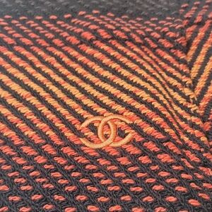 Stylish CHANEL scarf with bold black and orange stripes. Features iconic logo. Perfect for any ensemble.
