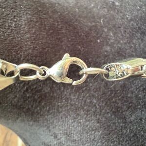 Necklace is silver rounded 22” box chain with claw clasp.