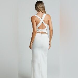 Showpo Anjie Plunge Neck Cross Back Cut Out Maxi Dress in white Size 4 LWD in EUC perfect for bachelorette, bridal shower, honeymoon little white dress sexy