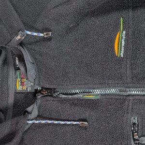 Stylish black hooded jacket featuring a front logo. Full zip closure with multiple pockets.