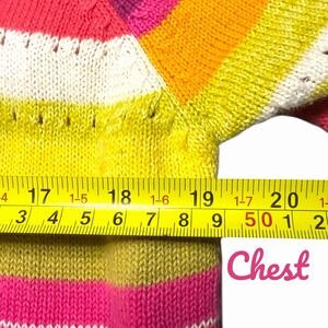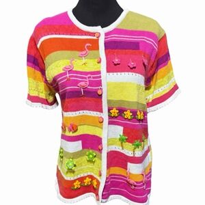 Whimsical and vibrant Susan Bristol knit cardigan featuring playful tropical appliqués throughout. This statement piece showcases felt flamingos, fish, turtles, palm trees, and floral details sewn onto a colorful striped knit base. A true novelty design with artistic charm and standout texture.