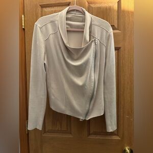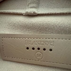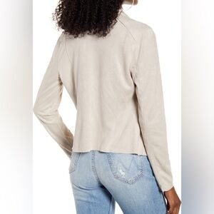 Chic cream faux suede draped blazer. The fabric is very “drapey”. It’s extremely soft and has a lot of stretch! Fabric is 90% Polyester and 10% Spandex.