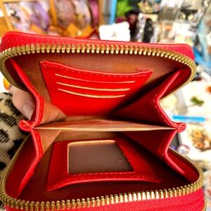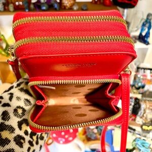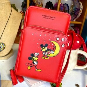 Red crossbody bag featuring hand drawn magical characters with a crescent moon design. Includes cross body strap. Bag has 3 zipper compartment, all working. No call outs.