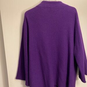 Dark purple with 3/4 sleeves. Broach style clasp at neck. Mid-weight wool. Measurements: length is 28 inches measured from top of shoulder seam; sleeve length is 26 inches from top edge of collar; chest measures 26 inches from armpit to armpit