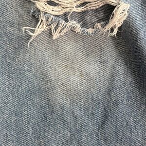 Casual boyfriend jeans with a relaxed fit. Light blue wash with distressed details. Works best for 5'4" and under. Small stain under right knee. See photos. Measurements are approximate and are taken laying flat.