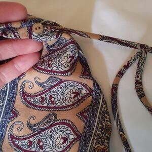 Lush paisley print romper in size Large. Beautiful bohemian paisley pattern in tan, brown, burgundy, and cream tones. Long sleeves with tie-back detail and V-neckline. Perfect for festivals, vacation, or boho-chic styling.